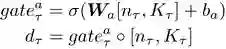 由于在生成每一个单词时都会对知识库(KB)中的信息进行更新,由推敲模块输出的知识信息Kτ中会包含与之前时刻生成的词相关的信息。放弃模块旨在过滤掉Kτ中的冗余信息,使最后生成的局部语义信息对于当前生成的词来说是特有的,能够更加捕获词粒度上的信息。放弃模块本质上是一个信息选择的过程,作者采用gate的方式获得最后的局部语义信息: