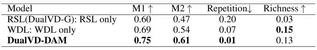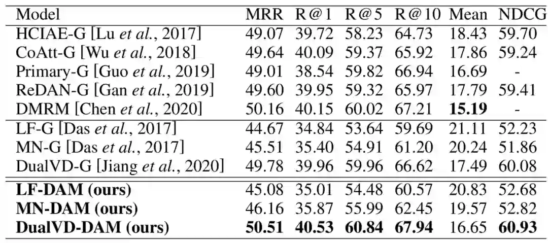 实验的总体结果如表1所示,LF-G、MN-G和DualVD-G是作者采用的基础模型(G代表对应的编码器和传统的生成式解码器搭配),LF-DAM、MN-DAM和DualVD-DAM是本文提出的模型。通过对表1的数据的分析可知:将传统的生成式解码器更换为DAM后,三个模型的表现均获得了提升;DualVD-DAM在大多数指标上达到了当前最好的结果。