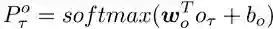 最后将记忆模块的输出oτ通过线性层映射到词表的大小,并返回概率最大的单词作为当前词的输出,词表中单词的概率分布计算公式为: