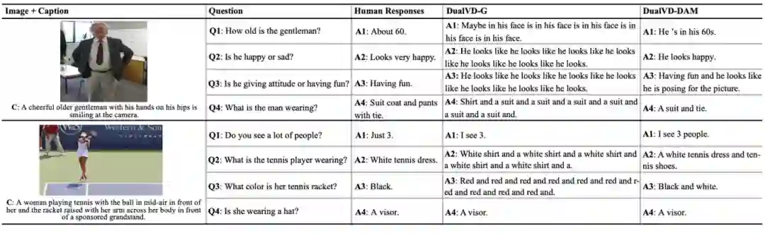 通过人工测评(表3)和案例分析(图5),作者发现与传统的生成式解码器相比,DAM可以有效的避免生成重复的单词,同时可以包含更多的细节信息。如图5中第一个例子:当问到“Q3: Is he giving attitude or having fun?”,DualVD-G生成了大量的重复单词,而DualVD-DAM通过“having fun”不仅仅回答正确了问题,而且进一步捕捉到了更多的细节信息“he looks like he is posing for the picture”。