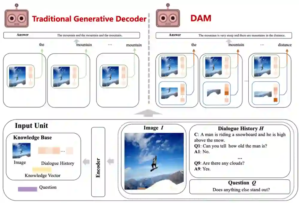在视觉对话领域中,大量的前人工作都集中在如何更好的编码输入的多模态信息,这是从信息输入的角度对输入的多模态信息进行理解;而对于句子的生成,显然是怎样更好的解码信息更加重要,由此作者从信息输出的角度对编码的多模态信息进行更好的语义表达和文本输出。如前文所述,传统的视觉对话生成式解码器仅仅是对输入的全局语义信息进行解码,导致回复中包含了大量的重复单词。如图1所示,作者提出了一种新颖的层次化的解码框架DAM,即在解码的过程中综合的考虑整体级别的全局语义(response-level semantics)和单词级别的局部语义(word-level semantics)。全局语义负责保证生成回复的整体语义的连贯性和准确性,局部语义负责捕获当前生成的词的特有的语义信息。模型的构建突出表现出了以下三个方面的优势: