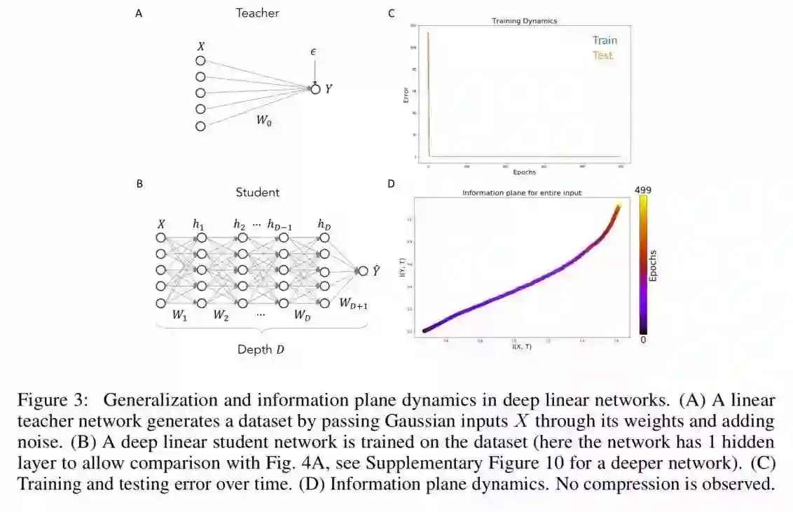 ……我们利用 student-teacher 设置(Seung et al.,1992;Advani & Saxe, 2017)下训练的简单线性网络探索泛化动态的最近结果。该设置可以让我们较精确地计算网络泛化性能和表征的互信息(未经分箱),以及直接对比线性高斯问题已知的信息瓶颈边界。