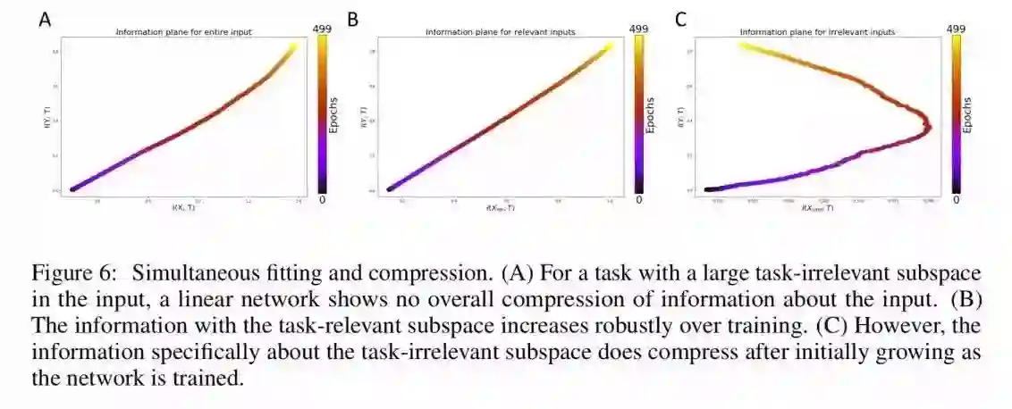 最后的实验将输入 X 分割成任务相关的输入和任务不相关的输入。前者贡献信号,后者贡献噪声。因此好的泛化似乎需要忽略噪声。论文作者发现当任务相关的信息发生拟合时,任务不相关的信息发生压缩,尽管整体看来没有观察到输入出现压缩阶段。