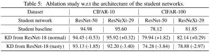 如下图5所示,展示了不同教师模型对应的 counterpart 模型结构的性能。训练方法对不同结构的 是具有泛化性的。比如我们正常训练教师模型 ResNet-18,并使用这个正常的教师模型进行知识蒸馏的话,学生模型 (CNN,ResNetC20,ResNetC32,ResNet18) 等都会涨点,说明知识蒸馏技术可以偷窃模型。但是若使用 ResNet18 作为 counterpart ,并使用这个 Nasty 的教师模型进行知识蒸馏的话,学生模型 (CNN,ResNetC20,ResNetC32,ResNet18) 等都会掉点。