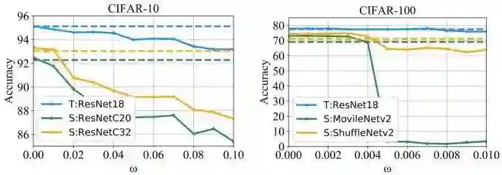 如下图所示是优化目标中式2中不同参数 的选择的影响。教师模型是 ResNet-18,学生模型使用 ResNet-C20 或者 ResNet-C32。实验发现: 越大,则教师模型变得越 toxic,蒸馏得到的学生模型的性能也就越差。但是随之而来的问题是教师模型的性能也会越来越差。
