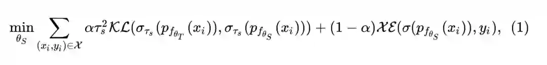 知识蒸馏通过从一个或多个训练有素的 "教师" 网络中提炼知识,以帮助 "学生" 网络的训练过程。通过模仿教师网络的软概率输出,学生网络能够吸收教师网络之前学习到的知识,并且学生网络的性能通常优于那些仅使用标签进行训练的网络。设预训练好的教师模型为 ,学生模型为 ,其中 和 分别代表网络的参数。设训练样本为 , 表示样本 通过网络 的输出结果。则学生模型 可以通过下式进行学习: