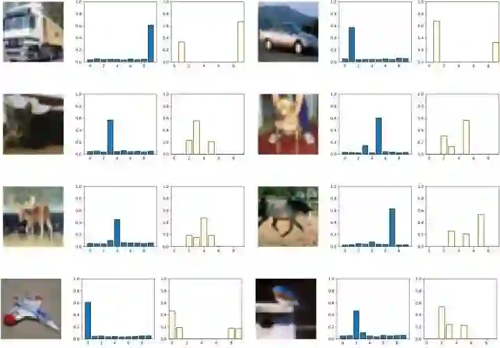 和 Nasty 教师模型之间的 KL 距离。这样一来,Nasty 教师模型既能够正确地完成分类任务,又不至于输出太 "sharp"。结果如下图1所示,自我破坏教师模型训练的结果如图1右侧所示。Nasty 教师模型这样非常均匀的输出使得很难对其进行有效地蒸馏。