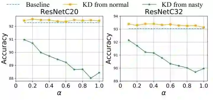 作者对式1中蒸馏目标函数的 做了对比实验。参数 用于平衡知识蒸馏过程中标签和教师模型重要性的占比, 越大,代表知识蒸馏中的教师模型越重要。作者取 分别为0.0到1.0之间的各个值,得到的结果如下:发现当 时学生模型性能最差。作者还观察到,当从 Nasty Teacher 那里提取信息时,一个较小的 值可以帮助学生网络表现得相对更好。然而,较小的 值也使学生较少依赖老师的知识,因此从知识蒸馏本身获益较少。