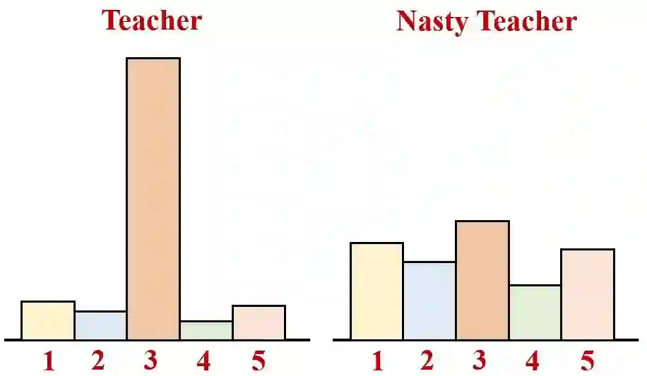 为了防止知识蒸馏的这种有害影响,本文想做的事情是想办法训练出一个不易被蒸馏的教师模型 (Undistillable Teacher Model),作者称这种教师模型为 "龌龊的教师模型 (Nasty Teacher)"。Nasty Teacher 的特点是:相比常规 Teacher 模型,在正常使用时性能保持不变或者略有下降,而在被知识蒸馏时得到的学生模型的性能很差,使得不法分子无法提供 KD 的手段完美地复制教师模型,从而做到保护模型所有者知识产权的作用,保护模型所有者的隐私。