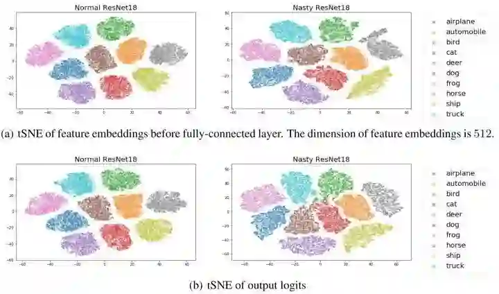 Nasty 教师模型的 ResNet-18 和正常教师模型的 ResNet-18 的特征空间类间距离表现相似,这与我们的目标一致,即 Nasty 教师模型应该表现得与正常教师模型相似,这也说明了为什么Nasty Teacher的精度和正常的差不多。但是输出 logits 有很大的偏移。
