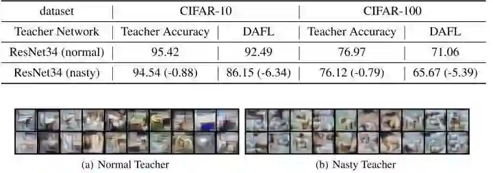 作者使用 DAFL 和 DeepInversion 作为 Baseline 模型,实验设置与原始论文完全一致。Data-Free KD 方法可以根据给定的教师模型,在没有原始训练数据的前提下蒸馏得到学生模型。为了验证本文方法的性能,也应该在根据给定的 Nasty 教师模型,在没有原始训练数据的前提下蒸馏得到学生模型。