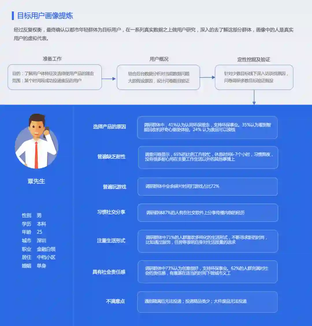 举个曾经项目经历,之前负责过某环保回收类的产品设计,一开始产品锁定的是一线、二线城市生活的主流青年群(其实目标用户细分很多,这里就不展开了)运营了一段时间做用户数据分析,发现大部分实际用户是50、60、70偏老年群体。