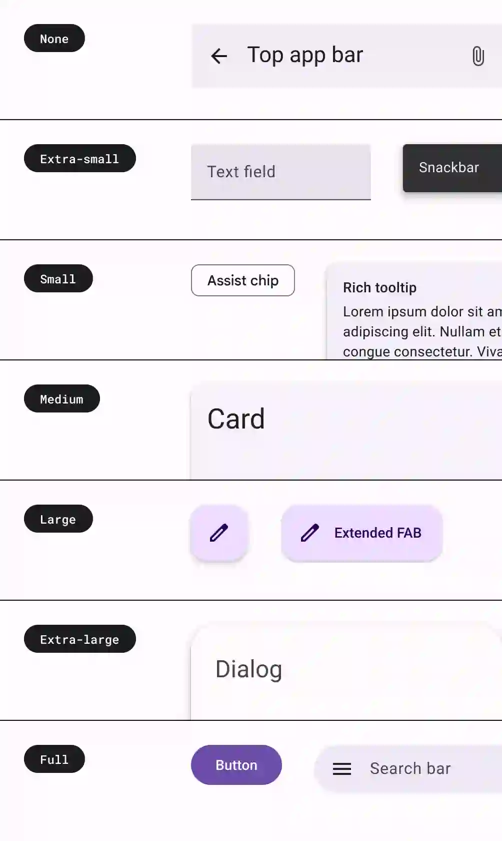 Material 3 形状比例定义了容器边角的样式,提供从方形到正圆形的一系列不同角度。