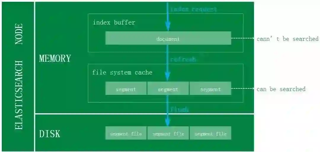 对于 ES 的写入机制有了解的同学可能会知道,新增的文档会被收集到 Indexing Buffer,然后写入到文件系统缓存中,到了文件系统缓存中就可以像其他的文件一样被索引到。