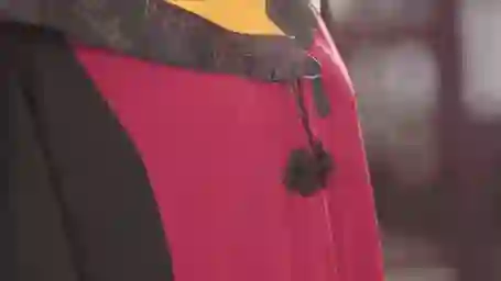 垂布是学位服的装饰物,也是最难穿戴的部分。垂布和学位袍的肩部都有快粘片,同学们根据自己的身高调整垂布粘贴位置,要使胸前垂布的三角形处于学位袍第一颗纽扣位置,并把垂布上的松紧扣扣在纽扣上,防止脱落。