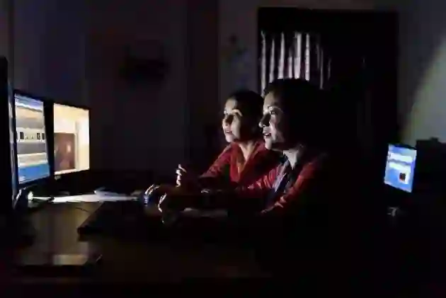 Shahria Hafiz Kakon(右)和同事正在观察EEG记录的数据。Smita Sharma for Nature