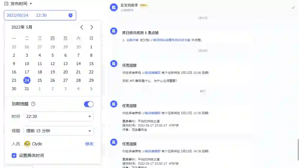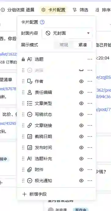 配合恰当的卡片配置,编辑们在无需点开卡片详情的情况下就能快速获取到每个选题及稿件的当前情况,遇到需要新增的字段类型时,也可以非常方便地直接在卡片配置中进行添加;遇到需要分配给特定成员完成的任务,只需要通过「人员」字段类型和细致的提醒设置功能,便能将看板与飞书直接关联起来,整套体验都不会跳出飞书之外。