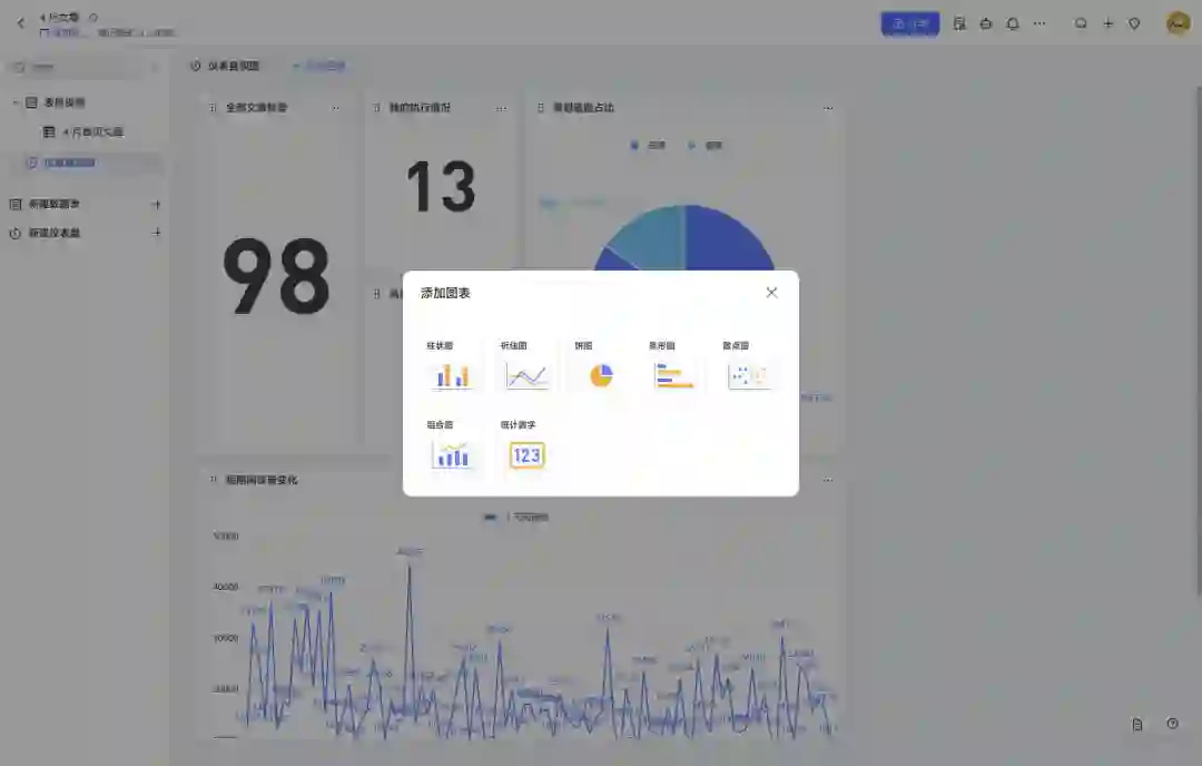 仪表盘生成的图表墙支持拖拽和网格大小自定义,稍加排列,就能生成一个集数字统计和折线、柱状、饼状图表为一体的仪表盘页面。因为仪表盘数据本身是与表格数据所关联的,表格内容有更新、删减时,数据变化也能直接反映在仪表盘上。