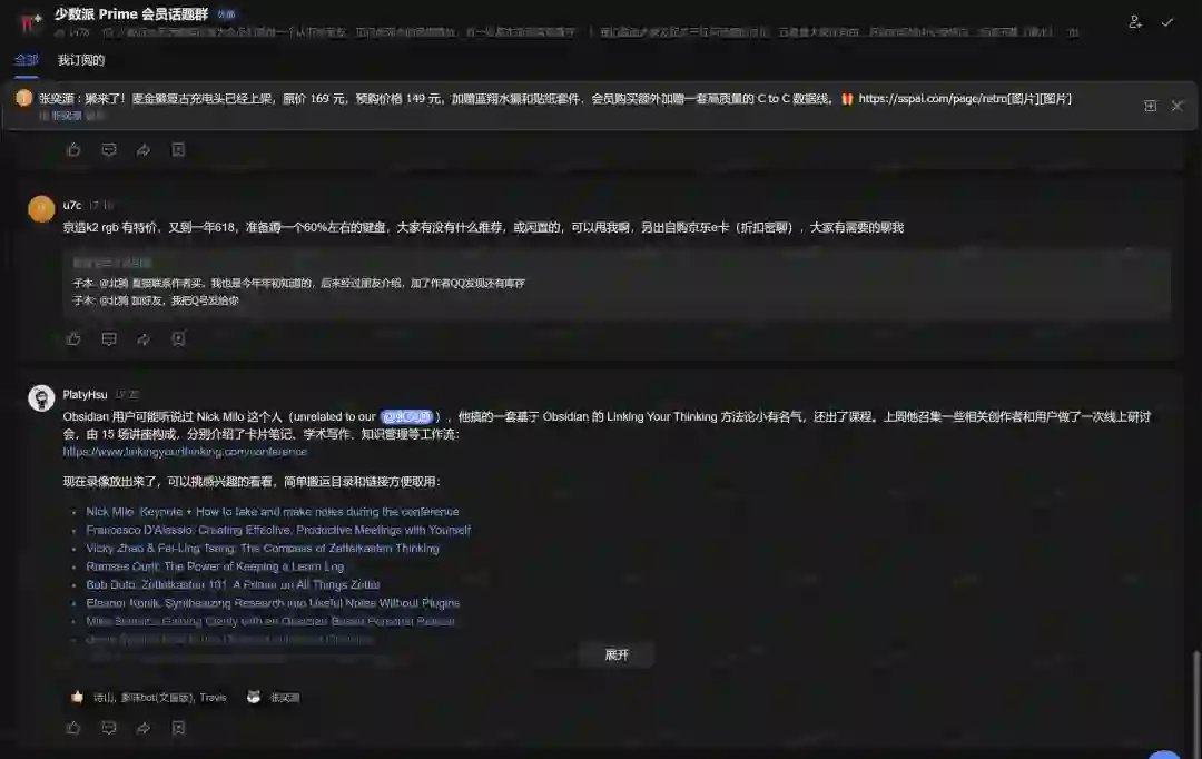 为了更好地连接少数派 Prime 会员,我们建立了会员专属的飞书话题群。话题群的特点是形式类似传统论坛,用户的每条发言都相当于一次「发帖」,其他人的回复和互动也会集中在这条「帖子」下面。在持续的讨论中,这样的形式更利于优质分享的沉淀。
