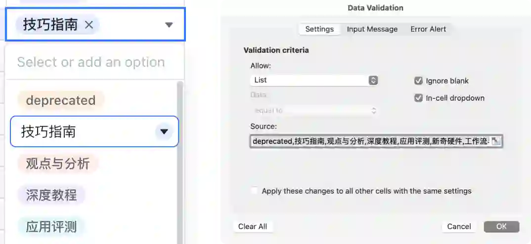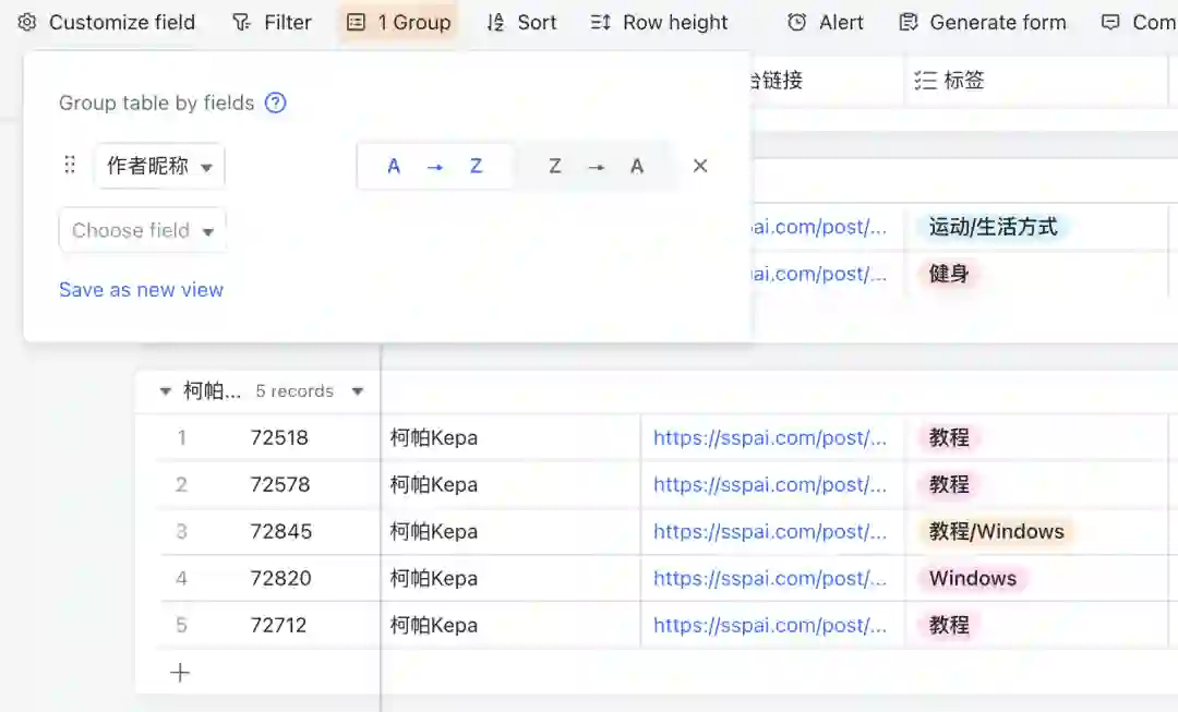 而在工作量最大的环节——依次为每篇文章选择合适的分类中,多维表格的功能也提供了不少便利: