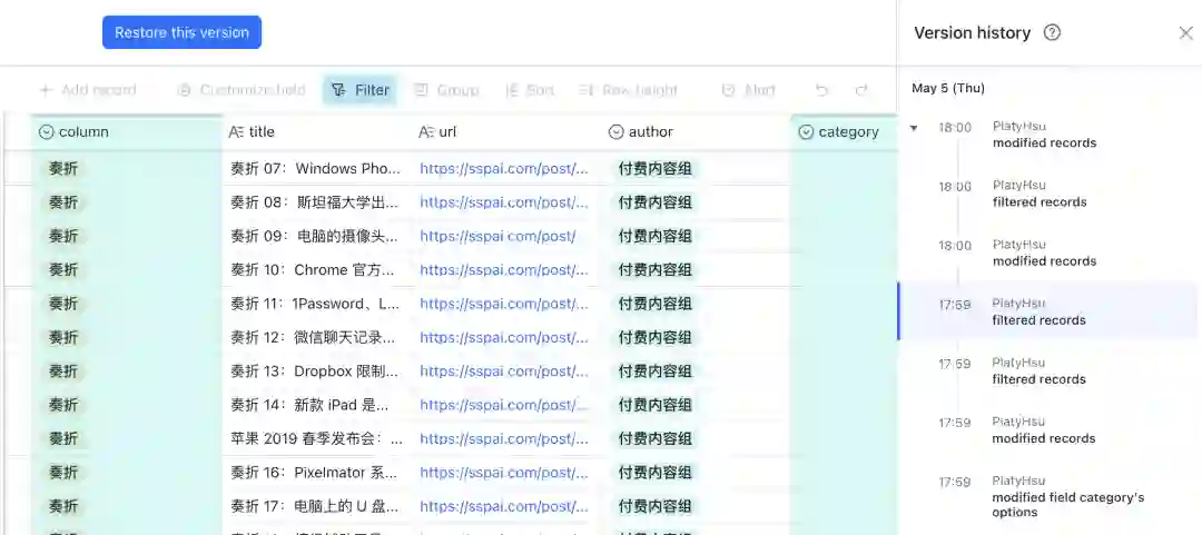 此外值得一提的是,用多维表格整理数据也让人感觉更踏实。一般认为,在本地处理文件,比使用云端服务更为稳定。但如果比较对象是 Excel 这个有着水星脾气、随时可能撂挑子的软件,多维表格即时保存、随处访问的特性就显得很可贵了。特别是随着需要整理数据量的增加,手滑、看走眼的几率也随之上升,因为一次误操作而破坏格式或内容的情况时有发生。多维表格虽然不能提前预防这种悲剧的发生,但可以忠实记录每一次操作历史,随时通过连续撤销还原到多步之前的操作,并通过版本历史功能对比和定位每一分钟的编辑过程。