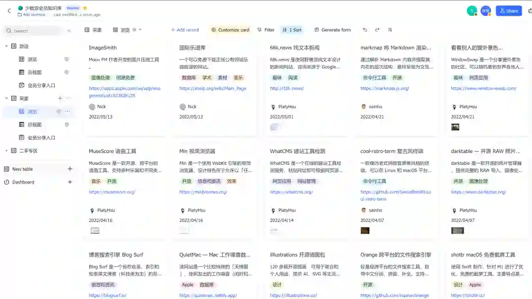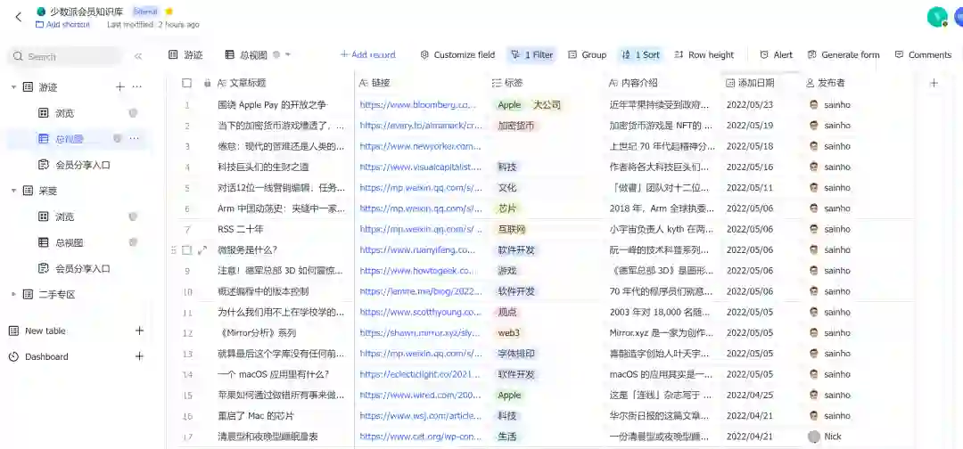 由此,我们也更进一步,利用飞书群组的文档权限管理特点,为 Prime 会员们提供了专享知识库。会员知识库使用飞书多维表格搭建,主要分为「游迹」和「采菱」两个版块。其中,「游迹」版块主要分享编辑们近期看到的好文章,而「采菱」则偏向推荐实用的工具、服务和网站。