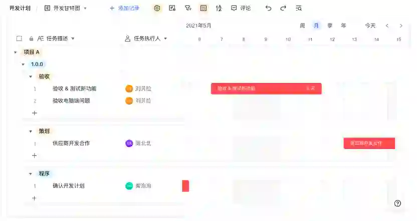 中,有可以安排每个项目、每个岗位、每个人工作内容的研发计划表,也有能够清晰展示每个任务、每个版本、每个岗位、每位成员任务内容和时间安排的甘特图;当项目成员需要了解自己在项目中的全部开发任务时,直接通过人员分组筛选功能就能以人员为维度转换出一份任务清单……