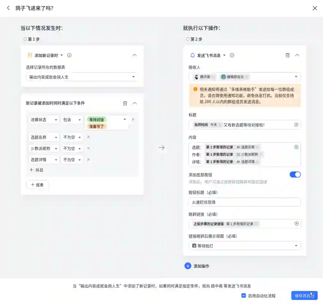 以这张「鸽子飞进来了吗?」流程为例,这套自动化的目的是在作者通过表单提交选题的同时,采集这条数据的某几条信息(作者、选题详情等)并推送给编辑部会议群组的所有成员,同时附上跳转按钮,让对选题感兴趣的编辑可以「火速赶往现场」。