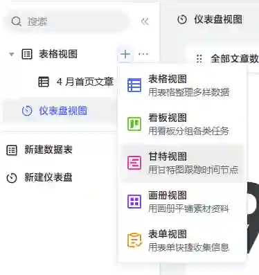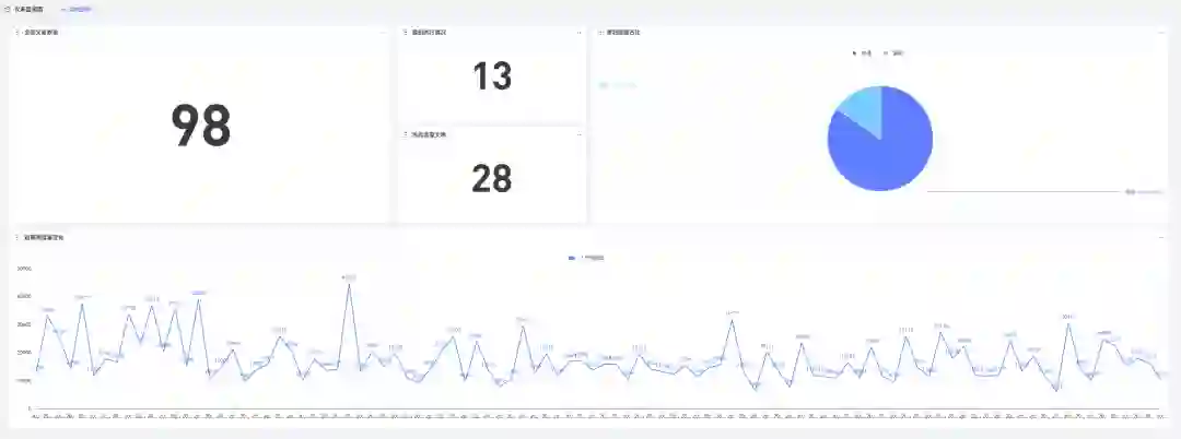 至于刚上线不久的仪表盘,则是为复盘、演示这类重可视化效果的场景准备的。在编辑部,我们直接导入网站后台生成的当月首页文章 CSV 表格数据,然后根据不同的展示需求,利用多维表格的仪表盘功能生成各种图表: