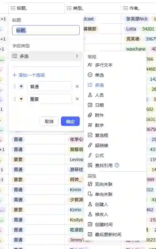 在另一项任务中,为了给会员用户提供更为便捷的阅读方式,我们重新整理了近四百篇历史文章的标签信息。为此,技术同事给我们提供了 CSV 格式的导出数据。这时,多维表格的 CSV 导入功能就派上了用场。我们发现,它的导入功能正确识别了 CSV 中的各项字段和记录,无需担心 Excel 导入非英语 CSV 时常见的乱码问题;对于数据类型的判断也基本准确。