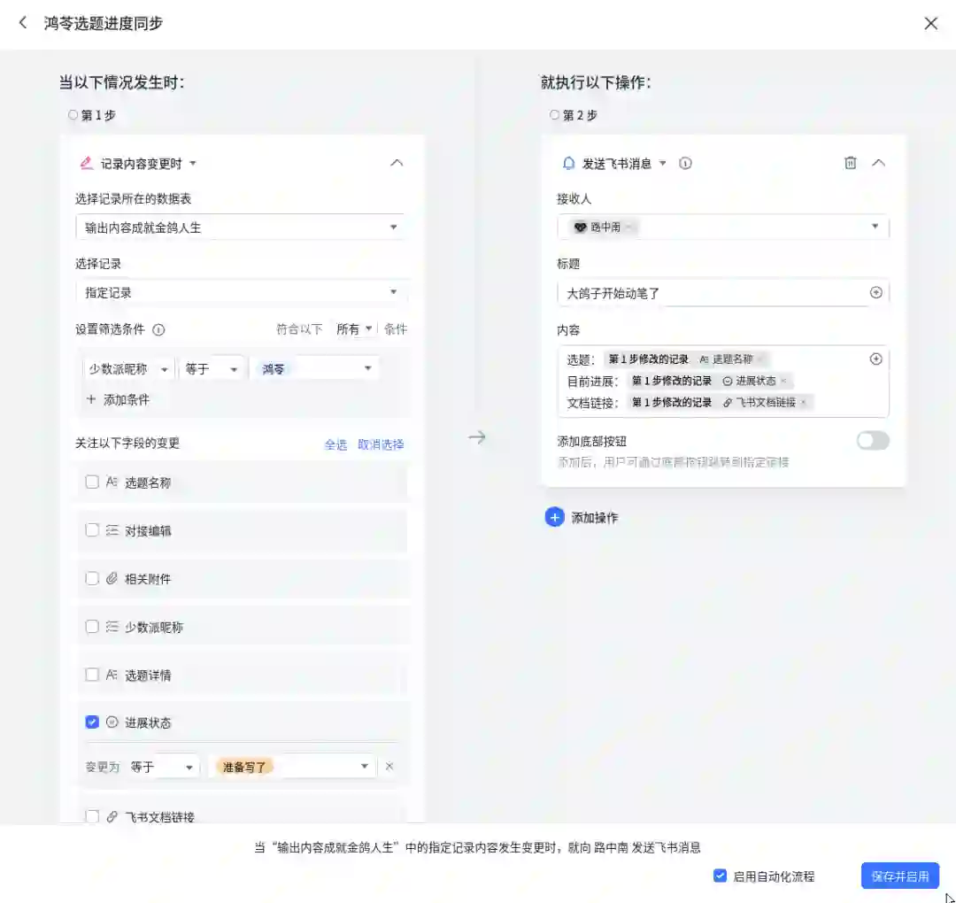 如此一来,每一条新建的多维表格数据都会带有完整的信息,选题推进的阻力大大减少。后续使用「自动化流程」时也可通过这些字段来进一步进行筛选。