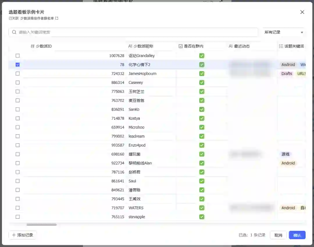 值得一提的是,多维表格此前上线的关联表格数据功能也非常实用,我们也借助这个功能将作者名单和选题看板关联了起来。