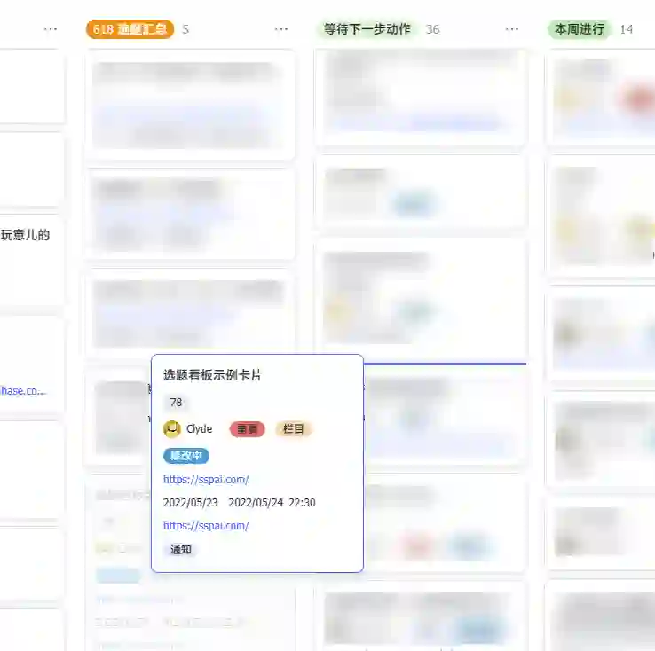 多维表格完全能够满足编辑部对看板工具的主要需求。通过自定义不同的字段类型,我们根据少数派网站首页文章的实际情况,为看板卡片增加各种清晰、明了的状态标签,包括文章是什么类型、现在是什么状态、截稿日期和发布时间各是什么时候、是否需要配合进行客户端推送等等。
