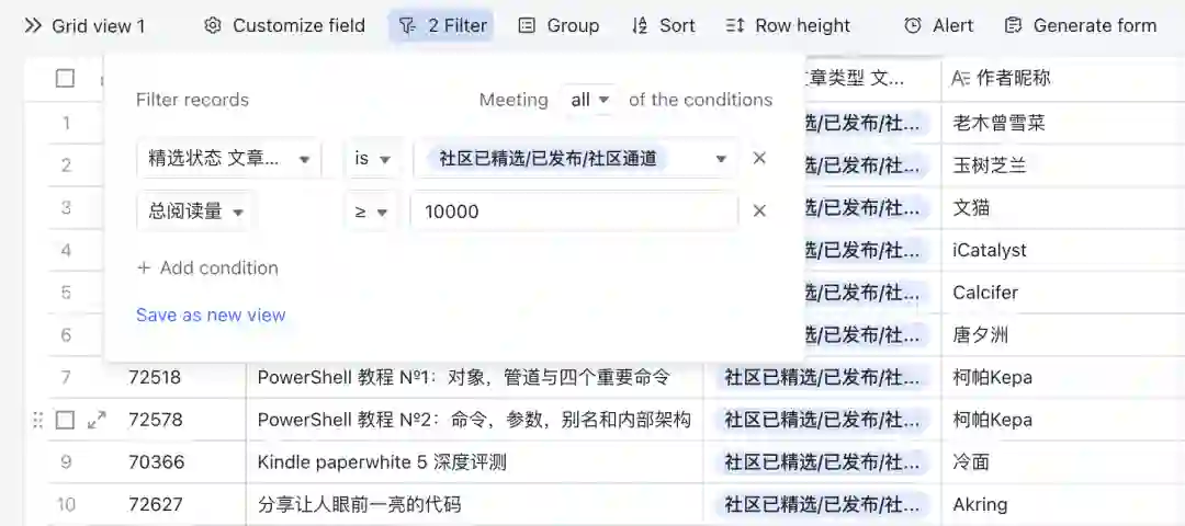 对于堆积了不少选题的资深作者,不少编辑都希望能够追踪某个作者的创作动向,这种看似笼统、细思又极恐的需求,以往或许只能借助「外力」,并且难以自动化。借助多维表格,则省去了平台跳转和人工维护,根据需求和数据使用方式的不同,多维表格在实际使用中拥有的可能性也多出来很多。就编辑部同事而言,他在初尝这一功能之后就已经有了不少想法: