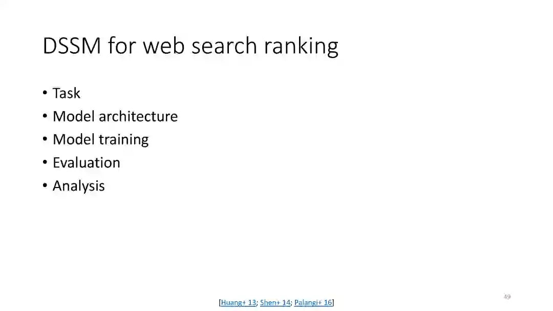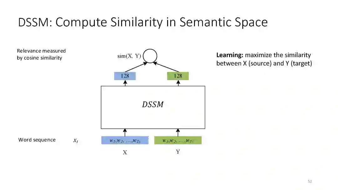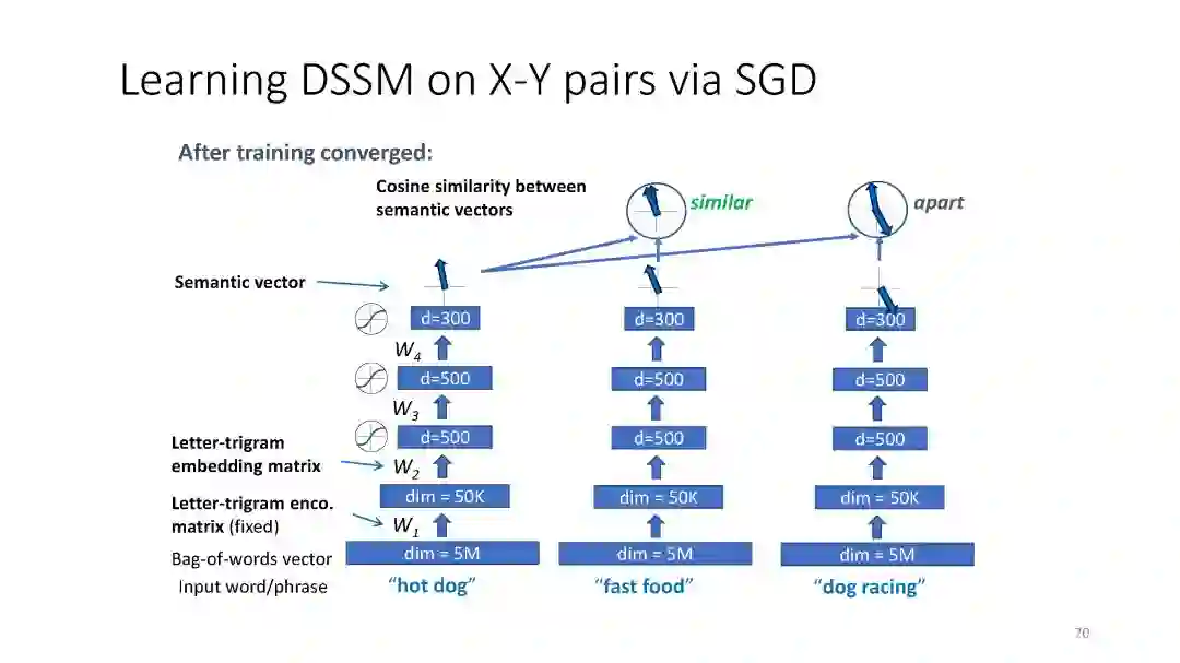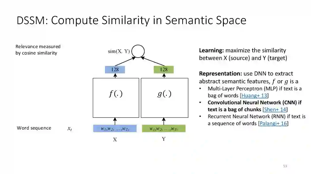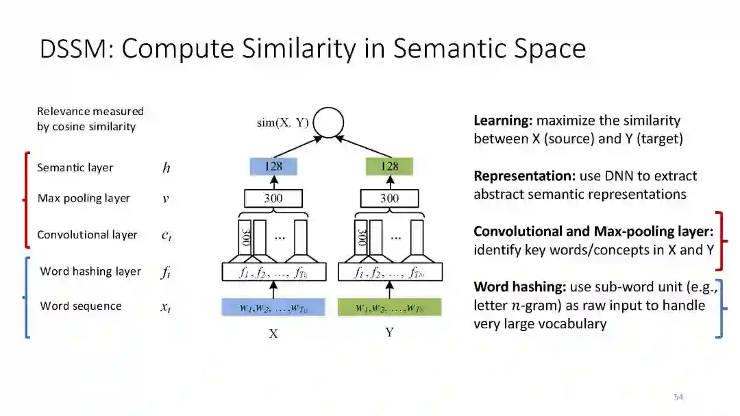 第二章 (DSSM): We have developed a series of deep semantic similarity models (DSSM, also a.k.a. Sent2Vec), which have been used for many text and image processing tasks, including web search [Huang et al. 2013, Shen et al. 2014], recommendation [Gao et al. 2014a], machine translation [Gao et al. 2014b], and QA [Yih et al. 2015].