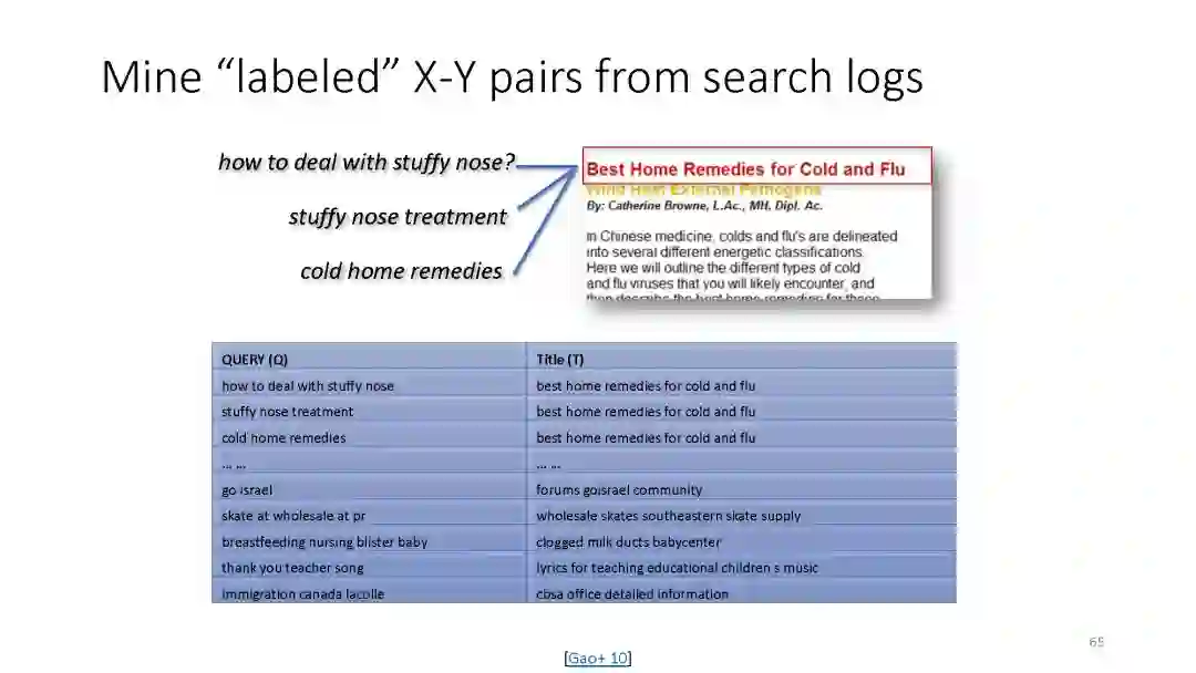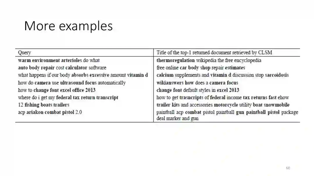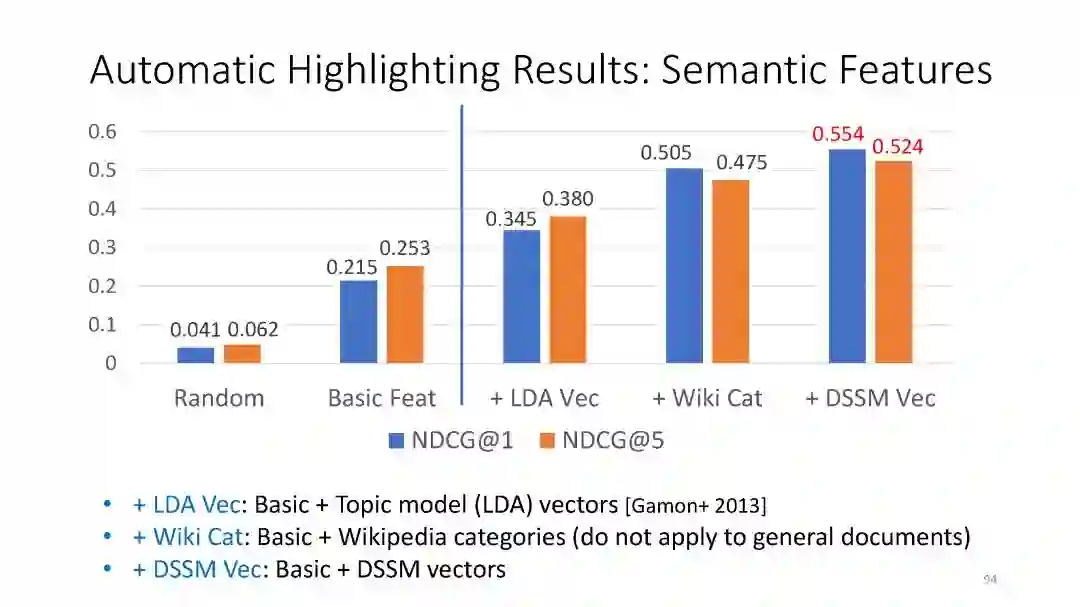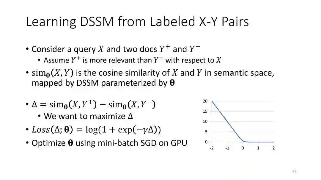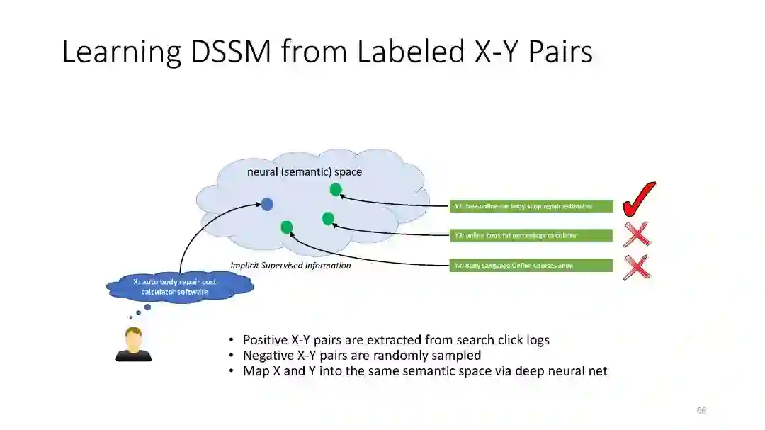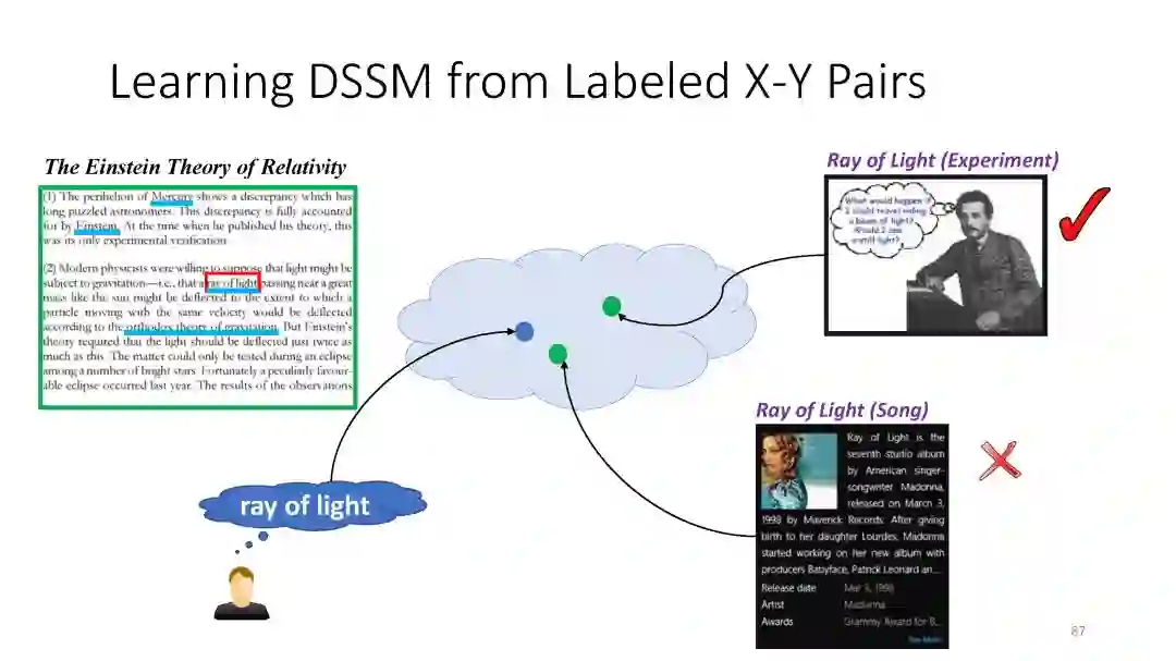 第二章 (DSSM): We have developed a series of deep semantic similarity models (DSSM, also a.k.a. Sent2Vec), which have been used for many text and image processing tasks, including web search [Huang et al. 2013, Shen et al. 2014], recommendation [Gao et al. 2014a], machine translation [Gao et al. 2014b], and QA [Yih et al. 2015].