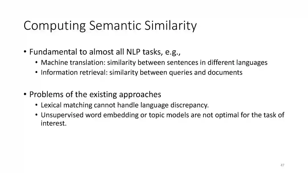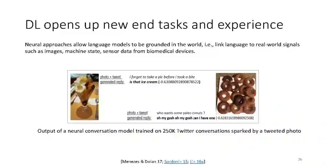 在这个演讲中,我将简要介绍深度学习的历史及其在自然语言处理(NLP)任务中的应用。 然后我详细描述了最近为三个NLP任务领域开发的深度学习技术方法。 首先是一系列深度学习模型,用于对文本和图像之间的语义相似性进行建模,该任务是网络搜索排名,推荐,图像描述生成和机器翻译等应用的基础。 其次是开发一套模型,解决机器阅读理解和自动问答相关问题。 第三个是将深度学习应用在各种对话工具上,包括面向具体任务的聊天机器人(比如智能客服)和社交型的通用聊天机器人(Siri, 小冰)。