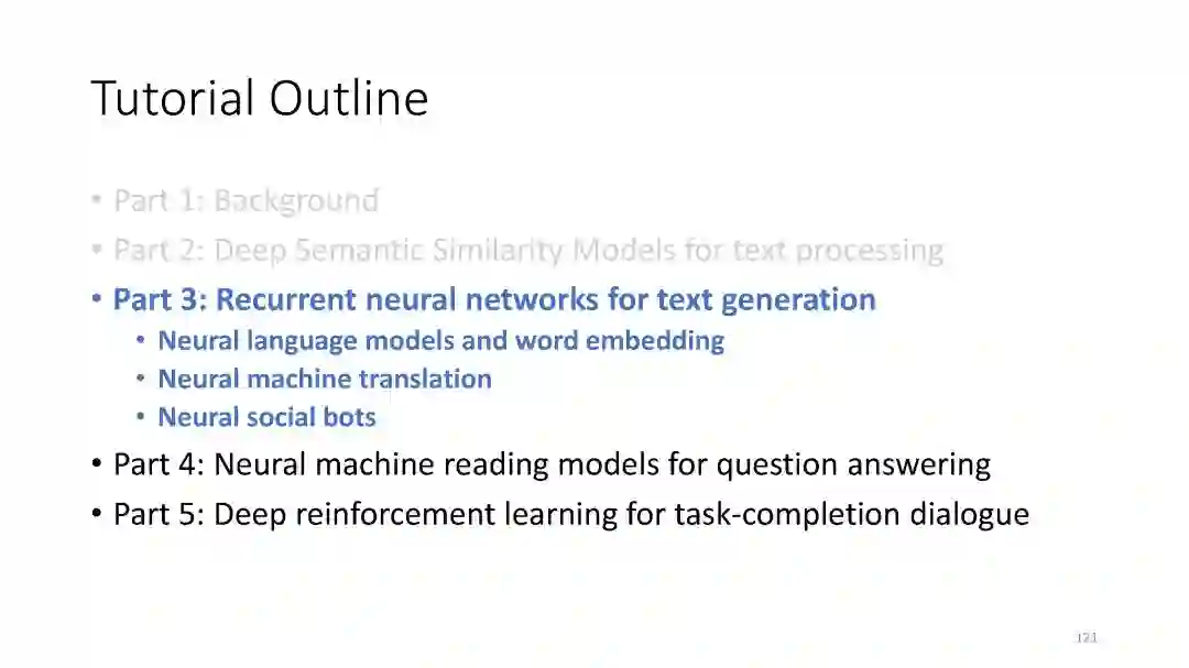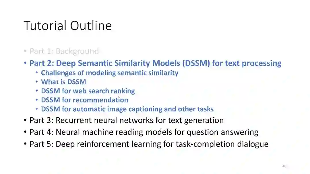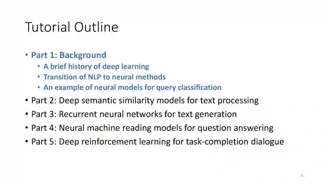 【导读】深度学习近几年在各领域的发展可谓是如火如荼,基于深度学习的自然语言处理方法也大受关注。本文介绍微软研究院Jianfeng Gao的一个暑期课程,课程主要讲解如何用深度学习做自然语言处理。课程主要分为四章:深度学习和自然语言处理(NLP)的介绍、用于文本处理的深度语义相似模型(DSSM)、用深度学习做机器阅读理解(MRC)和问答(QA)、基于深度学习的对话研究。相信通过学习该课程,你会对自然语言处理最新的方法有更深的理解,同时也希望能对您的科研或工作带来帮助。