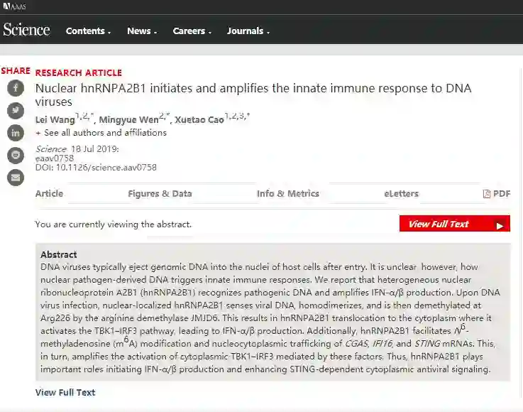 7月19日,学术期刊《科学》(Science)杂志以研究长文形式在线发表了中国工程院院士、南开大学校长曹雪涛团队的论文,报道该课题组发现了机体感知与甄别入侵病毒DNA的一种新型天然免疫识别受体(hnRNP-A2B1)。就像“哨兵”一样,该受体分子能够在细胞核内特异性地识别病毒DNA,随后激活天然免疫信号通路和诱导干扰素产生,启动天然免疫应答反应以清除DNA病毒的感染。这一细胞核内抗病毒“哨兵”的发现,开辟了天然免疫与炎症研究领域的新方向,也为抗病毒治疗与炎症疾病防治提供了潜在药物研发新靶标。