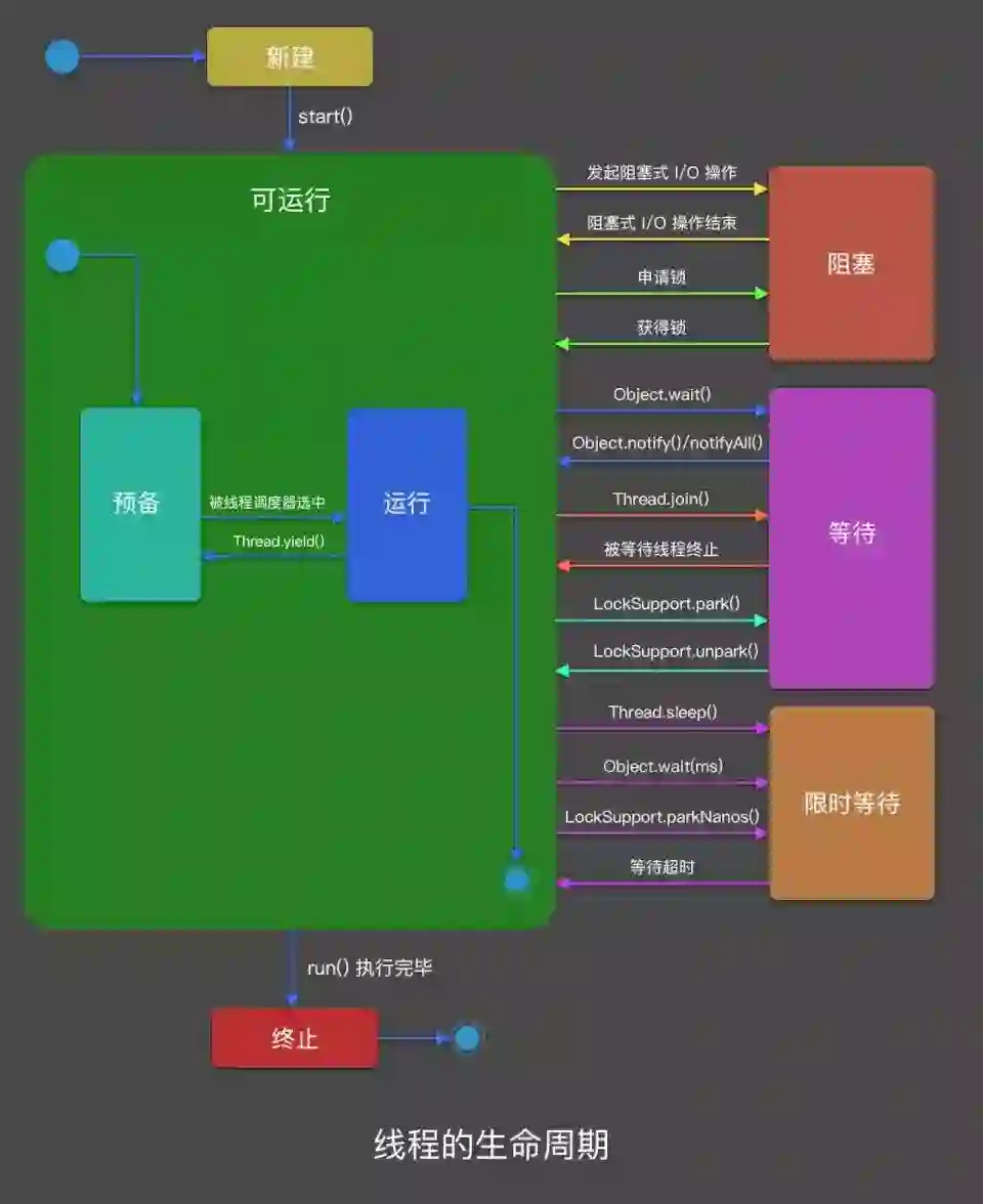 运行状态: 运行状态表示线程正在运行,也就是处理器正在执行线程的 run() 方法。当线程的 yield() 方法被调用后,线程的状态可能由运行状态变为预备状态。