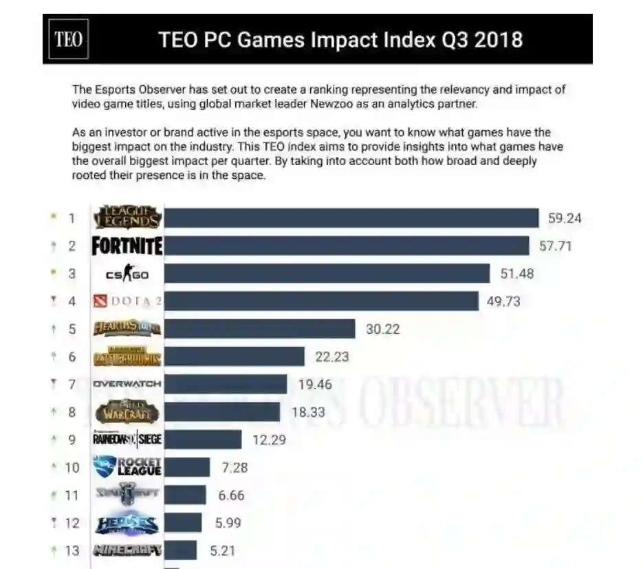 外媒The Esports Observe表示,根据话题度、搜索量、电竞赛事观看人数和在线人数等多个数据综合分析,英雄联盟到2018年第三季度为止依然是全球影响力最大的网络游戏。