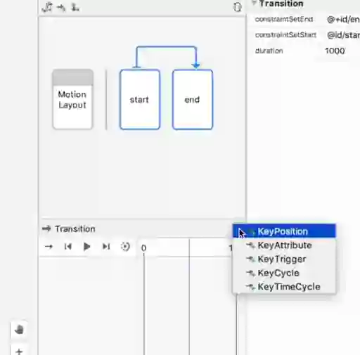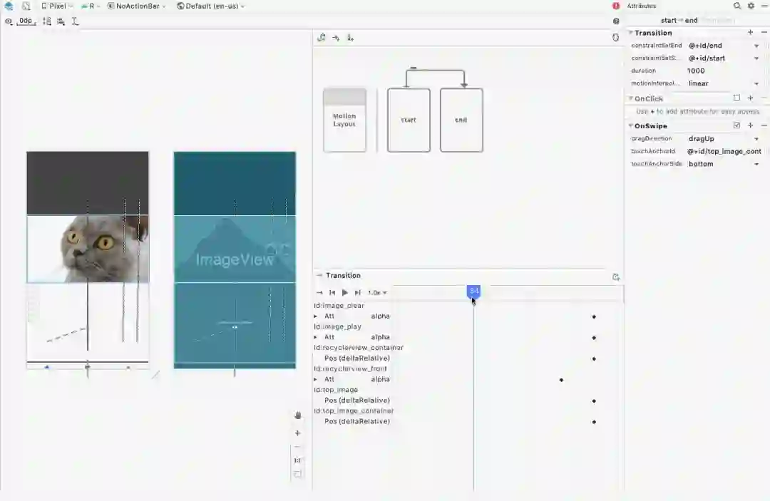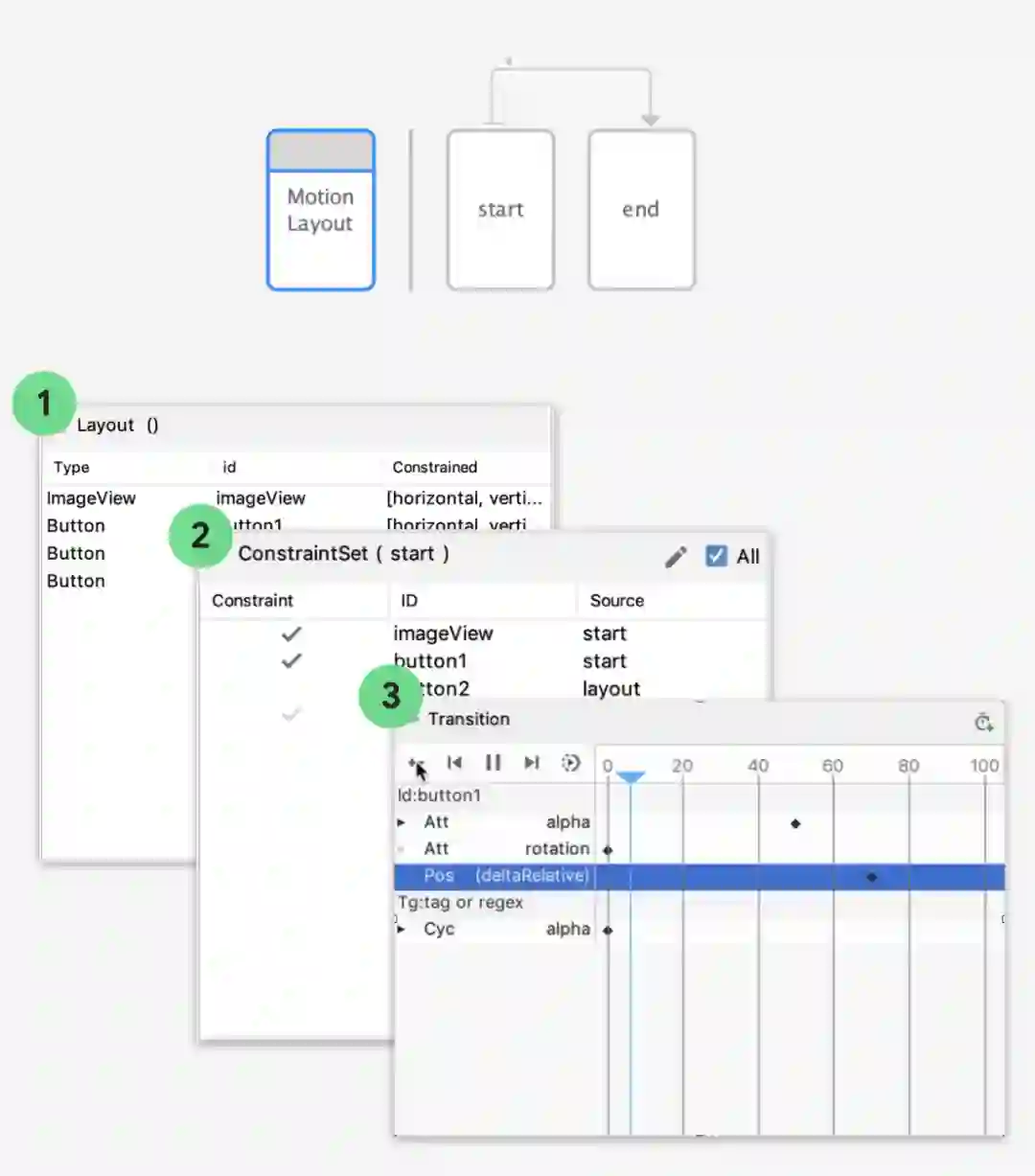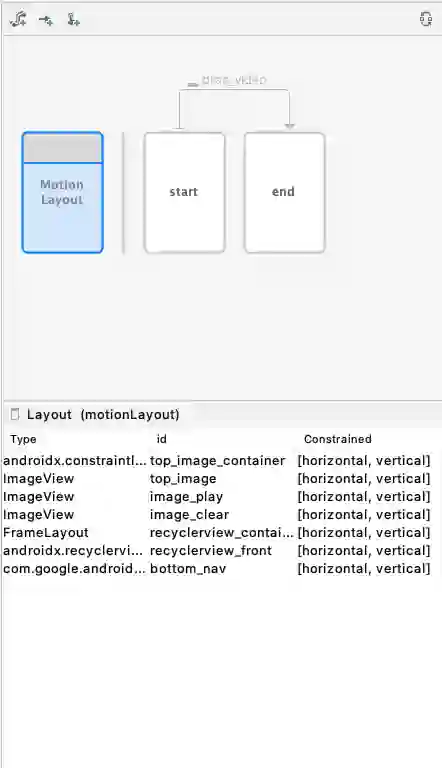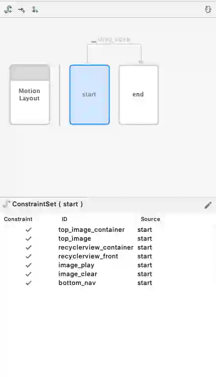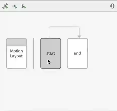 图中的 MotionLayout Scene 中有 start 和 end 两个 ConstraintSet,它们之间有一个 Transition 效果