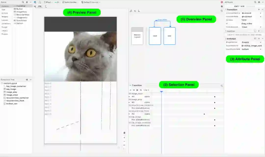 MotionLayout 可以对布局的变化做动画处理,在编辑器中该动画可被指定为 ConstraintSets 中的 Transition 效果。Motion Editor 可以通过 Overview 面板将这些状态的转变可视化。要编辑 ConstraintSet 中的约束,点击 Overview 面板中相应的选项即可。