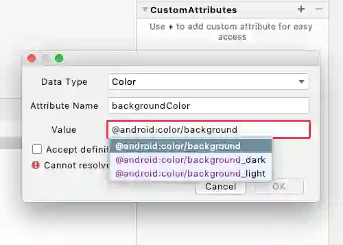 当您想对某个视图属性上添加动画效果时,而该属性却不属于 ConstraintLayout 或者 MotionLayout API (比如背景色) 时,可以在 Attribute 面板中创建自定义属性。我们还为自定义视图属性添加了自动填充和输入验证的功能,方便您的操作。