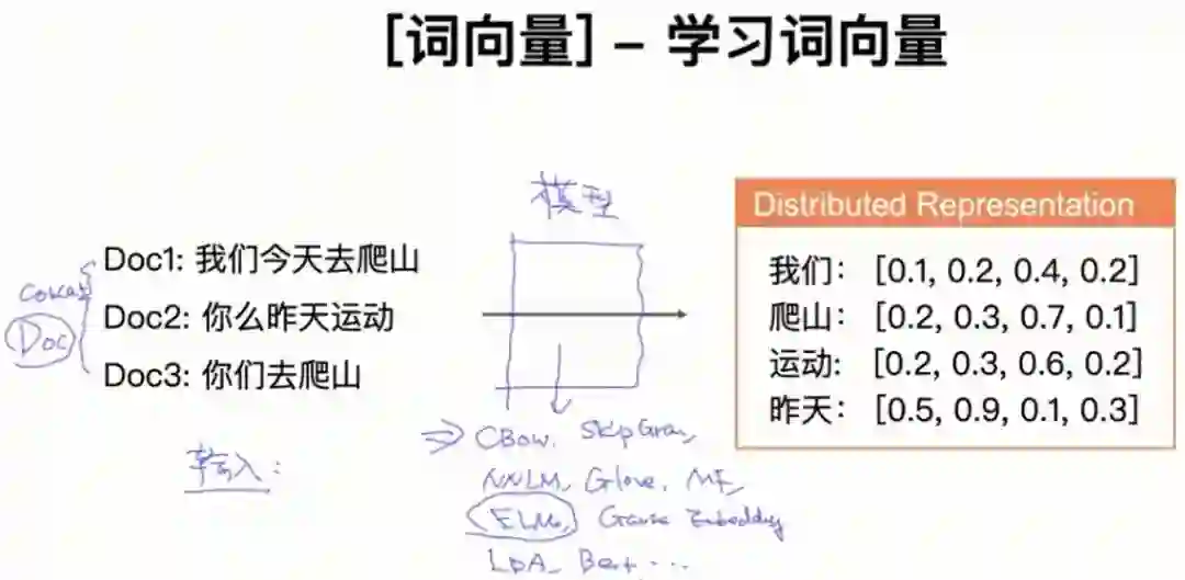 把一堆文本输入到某些模型中,我们可以得到词向量。模型包括:CBOW、Skip-Gram、NNLM、Glove、MF、ELMo、Gaus Embedding、LDA、Bert等。
