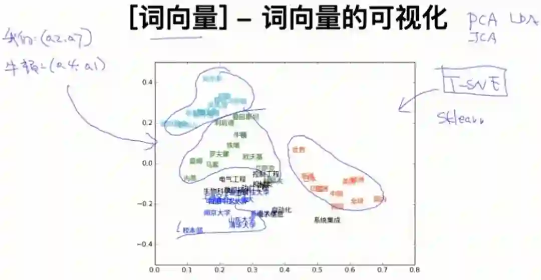 词向量的可视化常用的算法是sklearn中的T-SNE,它是一种降维算法。降维算法还有PCA、ICA、LDA,针对词向量的降维我们通常使用T-SNE,Bengio在他文章中介绍T-SNE非常清楚。我自己找了一下Bengio的文章,没有找到介绍T-SNE的内容,谁找到告诉一下哈!