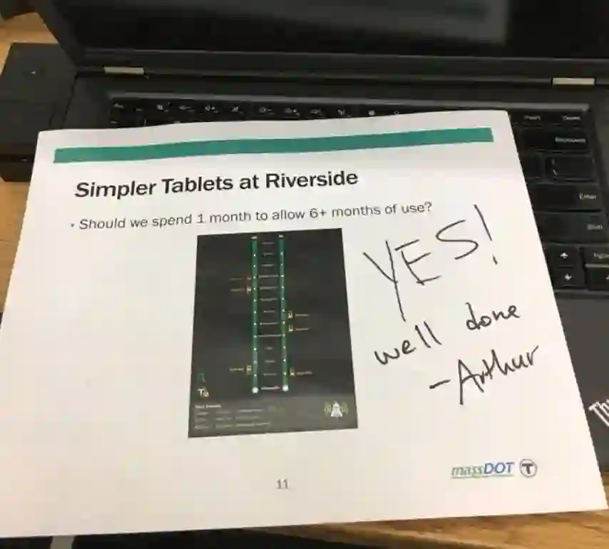 其实绿线可视化工具是一个显而易见的需求。但因为经费有限等各种原因,一直没有得到重视。直到我完成这个工具的设计和开发,以实验性项目的名义,项目组长争取到经费给调度员配备了几个平板。在短短半个月的试用之后,因为调度组的反馈非常好,MBTA正式成立了一个产品专项组负责针对绿线调度的产品研发。