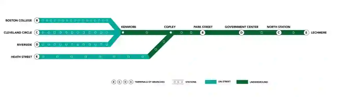 绿线是波士顿最早的地铁线路,准确说应该是轻轨,因为有部分是在路面上和其它车辆一起跑,乘客在马路中间上下车。据说建成于1897年,说得好听点叫很有历史感,但其实就是很老旧,每次起步和进站都是一阵巨响,比十年前国内的火车噪音还大。绿线有B、C、D、E共4条支路,四条支路有两个合并点,每条支路又有不同的终点。抵达终点的车辆会在终点掉头,并入到另一个方向继续运行。