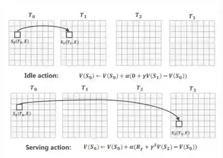 动作 (action):动作 a 定义了司机的完成订单或空闲操作。对完成订单而言,司机会经过前往接乘客、等待乘客和送乘客到目的地等过程。
