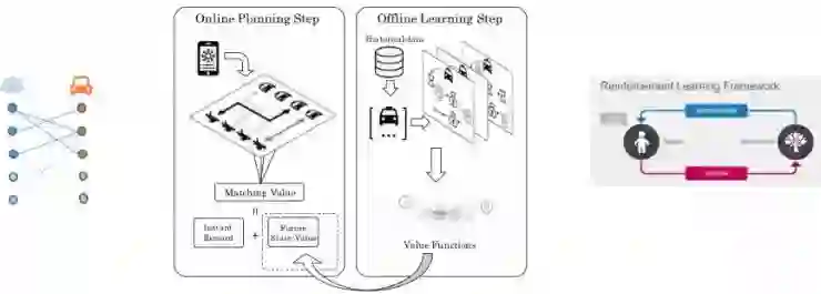 通过将二者结合,即将组合优化中的司机和乘客的匹配价值,用强化学习得到的价值函数 (Value Function) 来表示,即得到了所述的算法,其流程如下图所示。